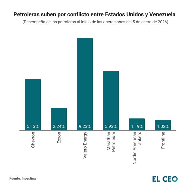 Las acciones de las principales empresas ligadas con la producción y refinación de petróleo registraron un alza en los mercados bursátiles de Nueva York en las operaciones de este lunes, luego de la captura del presidente depuesto de Venezuela, Nicolás Maduro, por parte del gobierno de Estados Unidos.