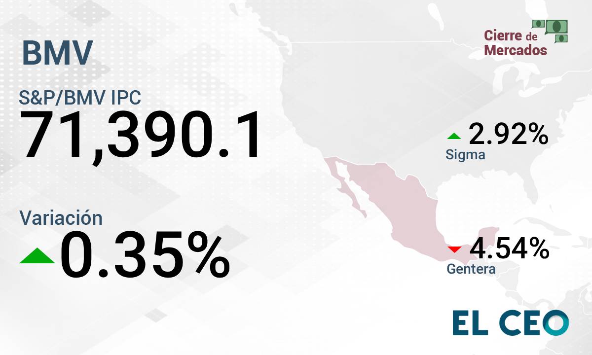 El Índice de Precios y Cotizaciones (IPC) de la Bolsa Mexicana de Valores (BMV) cierra las operaciones de este jueves con una ganancia de 0.35%, a 71,390.1 puntos, según datos de la propia institución bursátil.