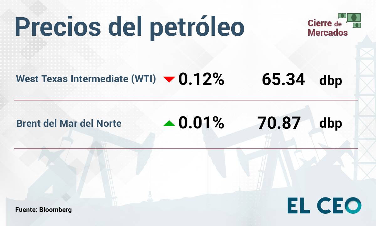 El contrato a marzo del West Texas Intermediate (WTI) bajó 0.12%, a 65.34 dólares. Por su parte, el contrato del Brent del Mar del Norte a marzo ganó 0.01%, a 70.87 dólares de acuerdo con Bloomberg.
