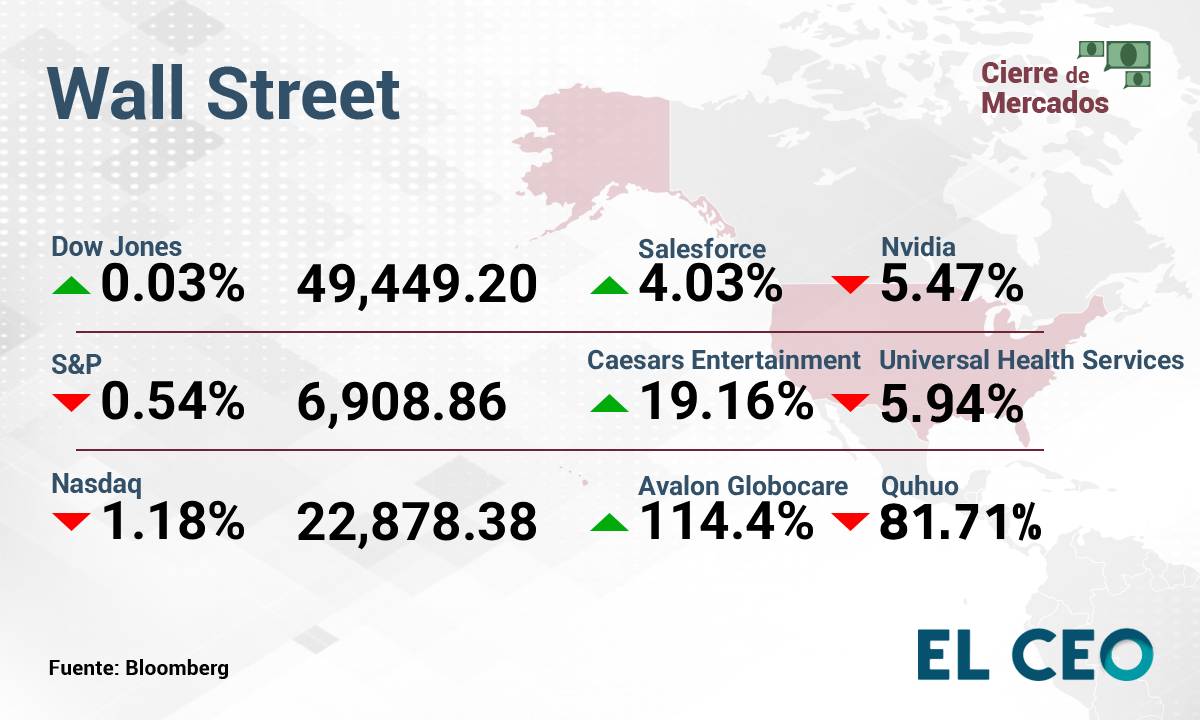 Wall Street cierra mixto tras reporte de Nvidia y Salesforce