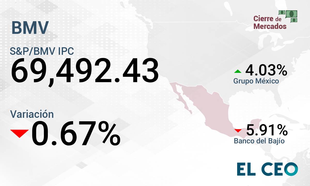 El Índice de Precios y Cotizaciones (IPC) de la Bolsa Mexicana de Valores (BMV) cierra las operaciones de este jueves con una pérdida de 0.67%, a 69,492.43 puntos, según la propia institución bursátil.