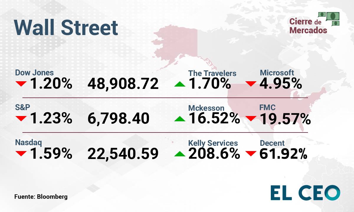 El S&P 500 perdió 1.23%, a 6,798.40 unidades, mientras que el Nasdaq Composite retrocedió 1.59%, a 22,540.59 puntos. Por su parte, el Promedio Industrial Dow Jones cedió 1.20%, a 48,908.72 unidades, de acuerdo con datos de Bloomberg.
