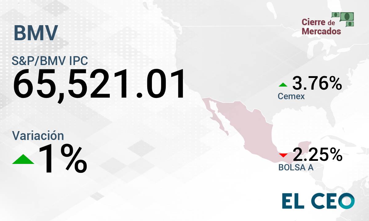 El Índice de Precios y Cotizaciones (IPC) de la Bolsa Mexicana de Valores (BMV) cerró la sesión de este jueves con una ganancia de 1%, a 65,521.01 puntos, de acuerdo con datos de la propia institución bursátil.