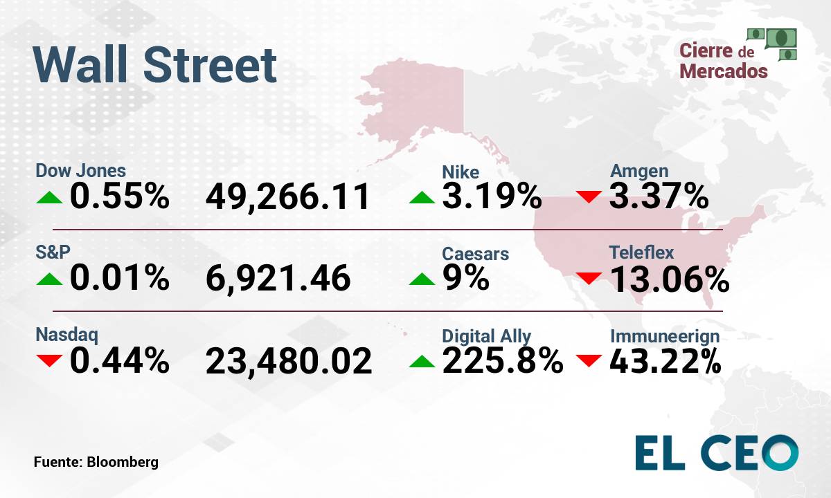 El S&P 500 ganó 0.01%, a 6,921.46 puntos, mientras que el Nasdaq Composite bajó 0.44%, a 23,480.02 unidades. Por su parte, el Dow Jones subió 0.55%, a 48,886.74 49,266.11, según datos de Bloomberg.