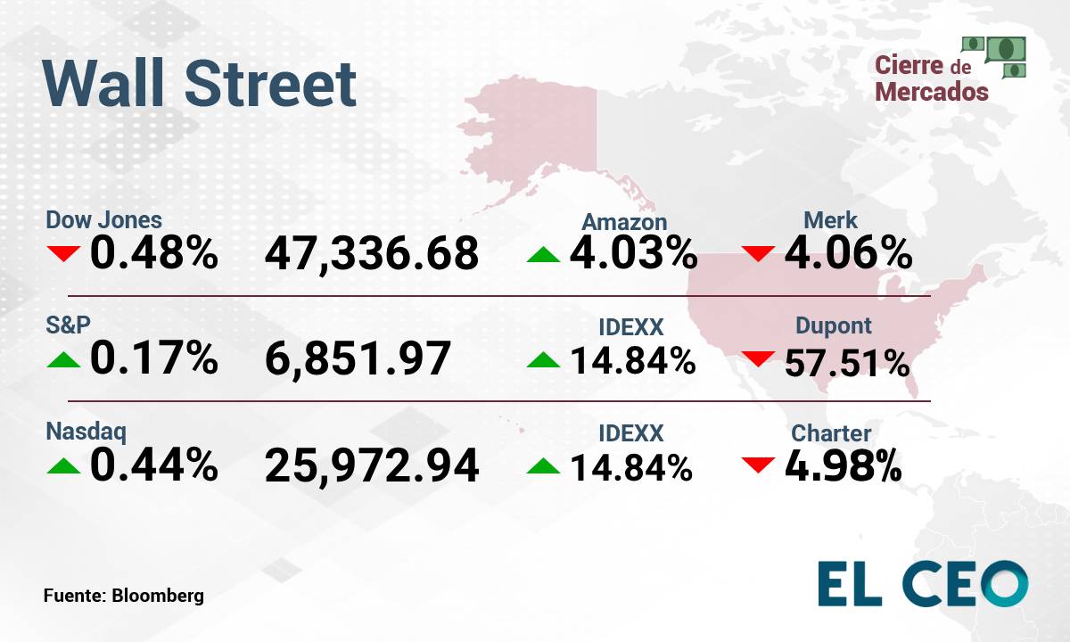 El S&P 500 ganó 0.17%, a 6,851.97 unidades; mientras que el Nasdaq Composite avanzó 0.44%, a 25,972.94 puntos. El Promedio Industrial Dow Jones retrocedió 0.48%, a 47,336.68 unidades, de acuerdo con datos de Bloomberg.