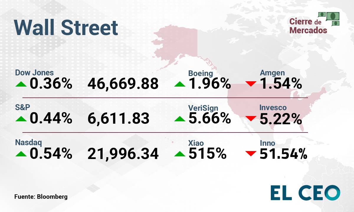 El S&P 500 ganó 0.44%, a 6,611.83 puntos, mientras que el Nasdaq Composite avanzó 0.54%, a 21,996.34 unidades. Por su parte, el Promedio Industrial Dow Jones subió 0.36%, a 46,669.88 puntos, de acuerdo con datos de Bloomberg.