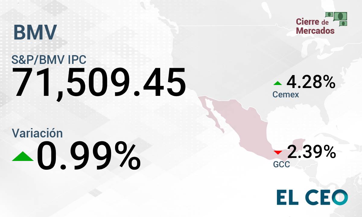 El Índice de Precios y Cotizaciones (IPC) de la Bolsa Mexicana de Valores (BMV) cierra las operaciones de este lunes con una ganancia de 0.99%, a 71,509.45 puntos, según la propia institución bursátil.