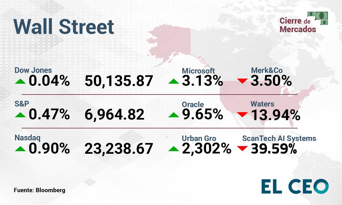 El S&P 500 ganó 0.47%, a 6,964.82 puntos, mientras que el Nasdaq Composite avanzó 0.90%, a 23,238.67 unidades. Por su parte, el Promedio Industrial Dow Jones subió 0.04%, a 50,135.87 puntos, de acuerdo con datos de Bloomberg.