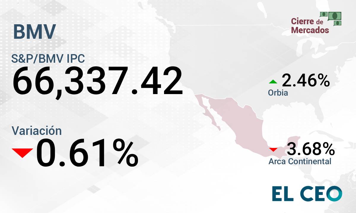 El Índice de Precios y Cotizaciones (IPC) de la Bolsa Mexicana de Valores (BMV) cerró la sesión de este martes con una pérdida de 0.61%, a 66,337.42 puntos, de acuerdo con datos de la propia institución bursátil.