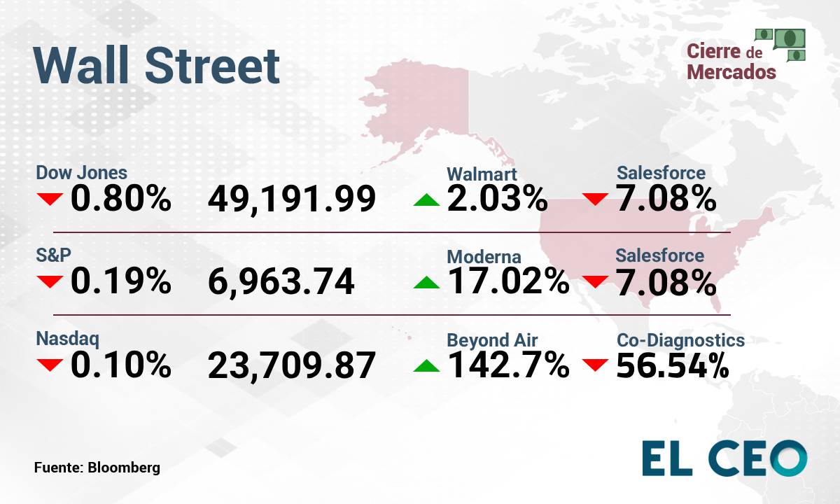 El S&P 500 perdió 0.19%, a 6,963.74 puntos, mientras que el Nasdaq Composite cayó 0.10%, a 23,709.87 unidades. Por su parte, el Dow Jones retrocedió 0.80%, a 49,191.99 puntos, según datos de Bloomberg.