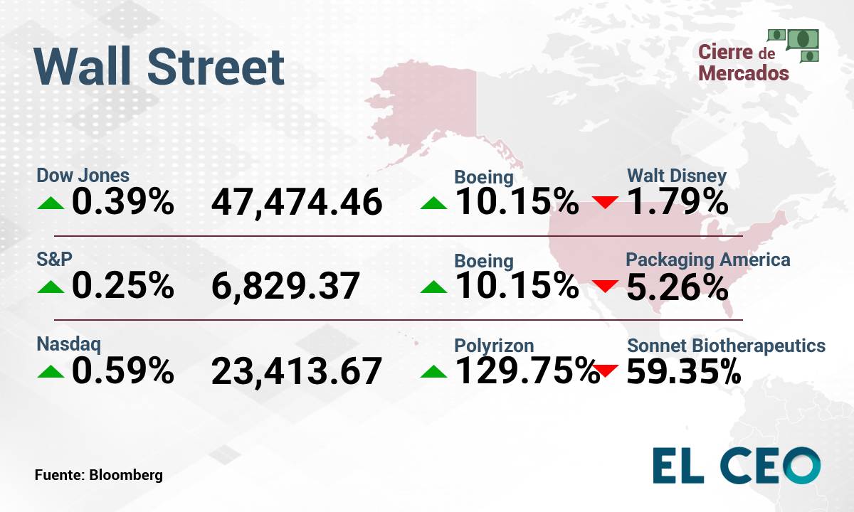 El S&P 500 ganó 0.25%, a 6,829.37 puntos, mientras que el Nasdaq Composite avanzó 0.59% a 23,413.67 unidades. Por su parte, el Dow Jones subió 0.39% a 47,474.46 puntos, de acuerdo con Bloomberg.