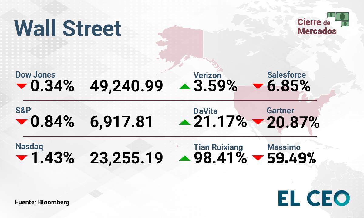 El S&P 500 perdió 0.84%, a 6,917.81 unidades, mientras que el Nasdaq Composite retrocedió 1.43%, a 23,255.19 puntos. Por su parte, el Promedio Industrial Dow Jones cedió 0.34%, a 49,240.99 unidades, de acuerdo con datos de Bloomberg.