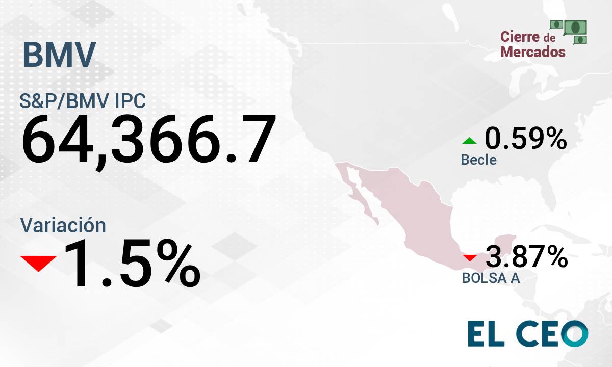 El Índice de Precios y Cotizaciones (IPC) de la Bolsa Mexicana de Valores (BMV) cerró la sesión de este martes con una pérdida de 1.5%, a 64,366.7 puntos, de acuerdo con datos de la propia institución bursátil.