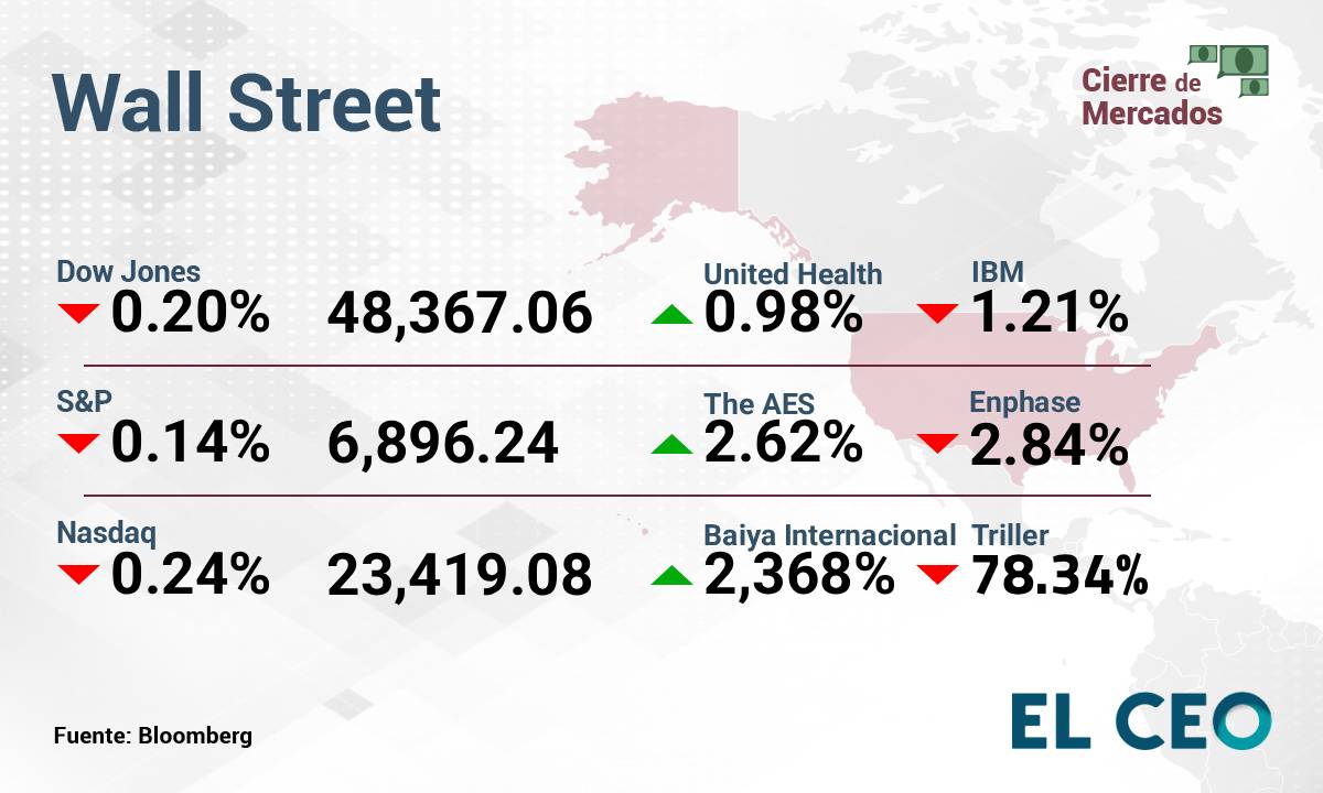 El S&P 500 perdió 0.14%, a 6,896.24 puntos, mientras que el Nasdaq Composite bajó 0.24%, a 23,419.08 unidades. Por su parte, el Dow Jones retrocedió 0.20%, a 48,367.06 puntos, según datos de Bloomberg.