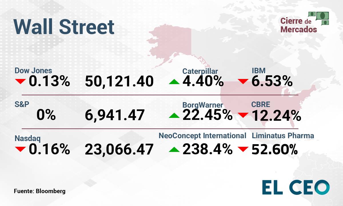 El S&P 500 se mantuvo sin movimiento a 6,941.47 puntos, mientras que el Nasdaq Composite cayó 0.16%, a 23,066.47 unidades. Por su parte, el Promedio Industrial Dow Jones perdió 0.13%, a 50,121.40 puntos, de acuerdo con datos de Bloomberg, en una jornada volátil.