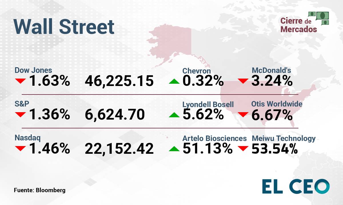 El S&P 500 perdió 1.36%, a 6,624.70 puntos, mientras que el Nasdaq Composite retrocedió 1.46%, a 22,152.42 unidades. Por su parte, el Promedio Industrial Dow Jones cedió 1.63%, a 46,225.15 puntos, de acuerdo con datos de Bloomberg.