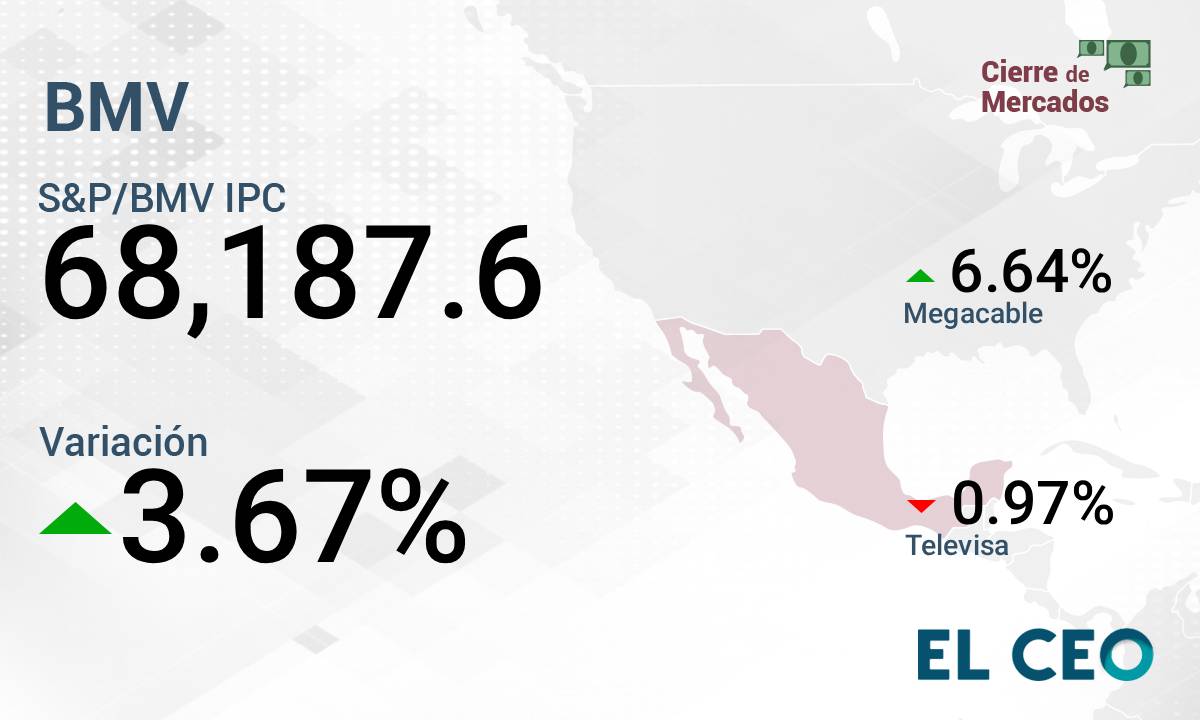 El Índice de Precios y Cotizaciones (IPC) de la Bolsa Mexicana de Valores (BMV) cierra las operaciones de este miércoles con un alza de 3.67%, a 68,187.6 puntos, según datos de la propia institución bursátil.