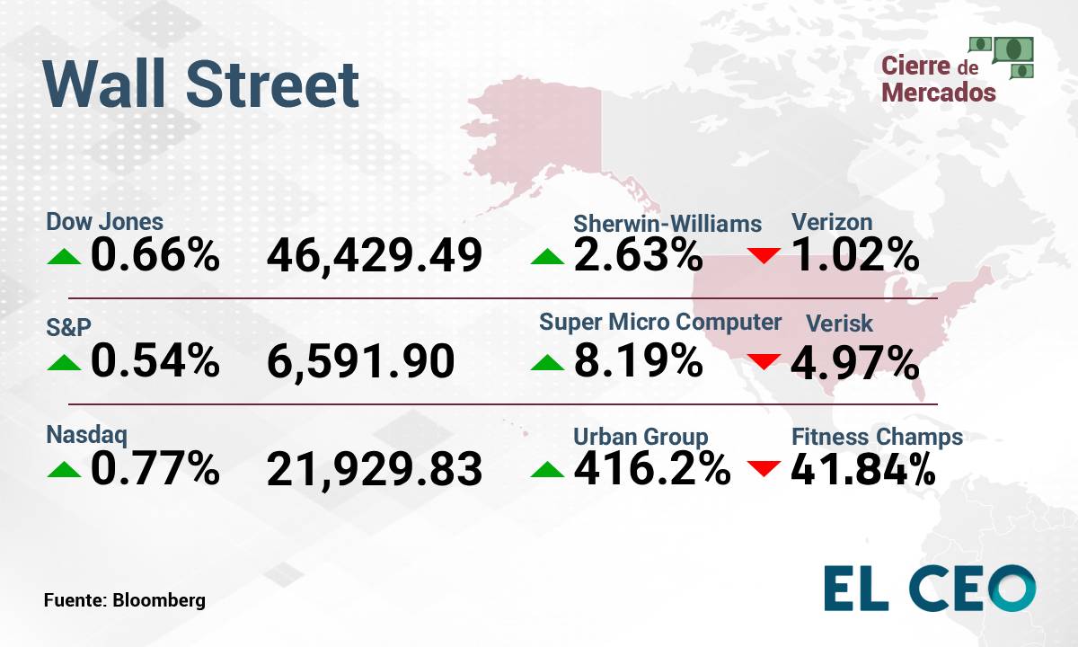 El S&P 500 ganó 0.54%, a 6,591.90 puntos, mientras que el Nasdaq Composite subió 0.77%, a 21,929.83 unidades. Por su parte, el Promedio Industrial Dow Jones avanzó 0.66%, a 46,429.49 puntos, de acuerdo con datos de Bloomberg.