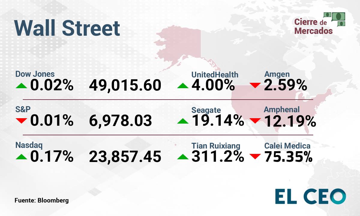 El S&P 500 perdió 0.01%, a 6,978.03 unidades, mientras que el Nasdaq Composite subió 0.17%, a 23,857.45 puntos. Por su parte, el Promedio Industrial Dow Jones ganó 0.02%, a 49,015.60 unidades, de acuerdo con datos de Bloomberg.