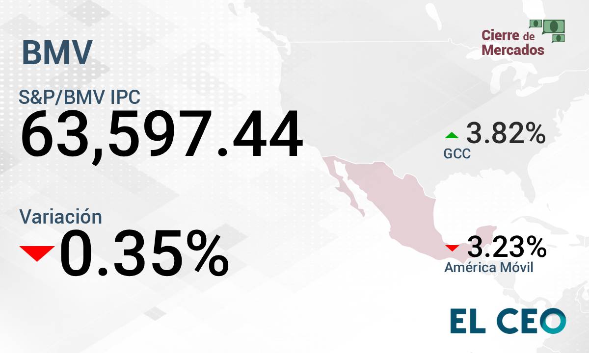 El Índice de Precios y Cotizaciones (IPC) de la Bolsa Mexicana de Valores (BMV) cierra las operaciones de este miércoles con una pérdida de 0.35%, a 63,597.44 puntos, de acuerdo con la propia institución bursátil.