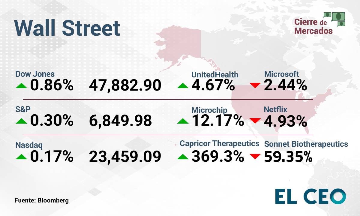 El S&P 500 ganó 0.30%, a 6,849.98 puntos, mientras que el Nasdaq Composite avanzó 0.17% a 23,459.09 unidades. Por su parte, el Dow Jones subió 0.86% a 47,882.90 puntos, de acuerdo con Bloomberg.