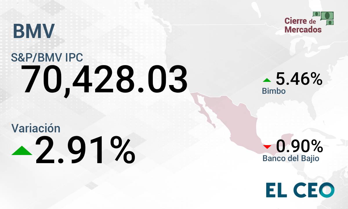 El Índice de Precios y Cotizaciones (IPC) de la Bolsa Mexicana de Valores (BMV) cierra las operaciones de este miércoles con una ganancia de 2.91%, a 70,428.03 puntos, según datos de la propia institución bursátil.