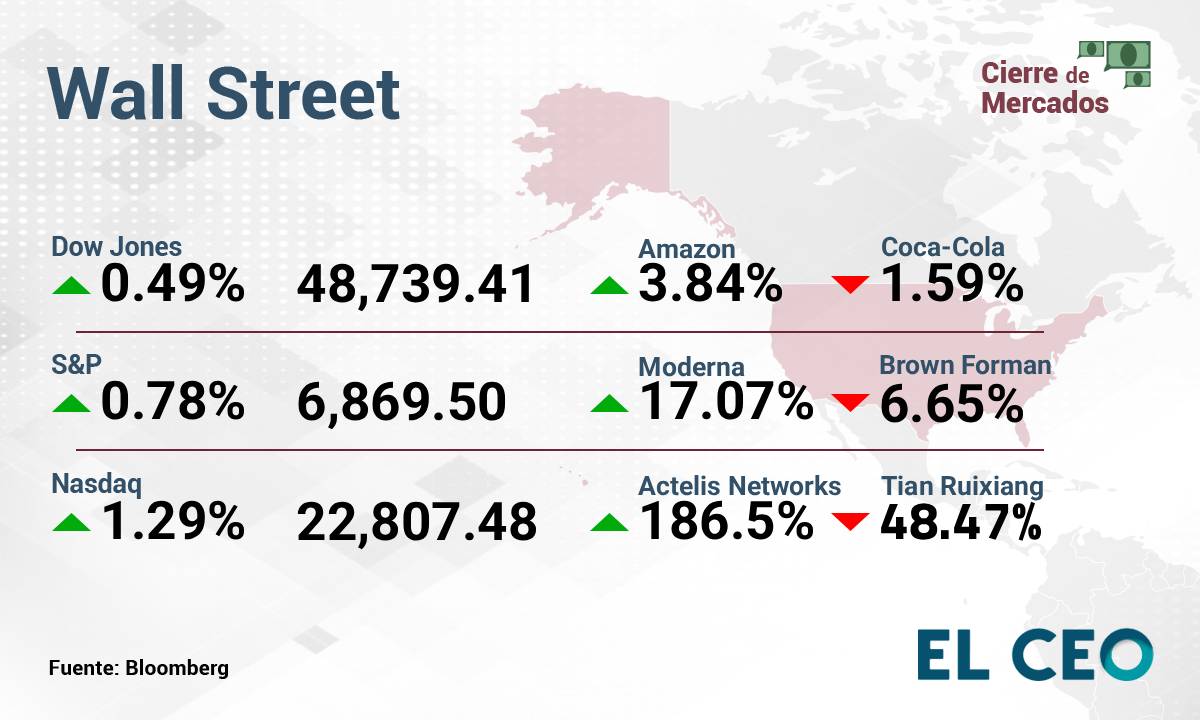 El S&P 500 ganó 0.78%, a 6,869.50 puntos, mientras que el Nasdaq Composite avanzó 1.29%, a 22,807.48 unidades. Por su parte, el Promedio Industrial Dow Jones subió 0.49%, a 48,739.41 puntos, de acuerdo con datos de Bloomberg.
