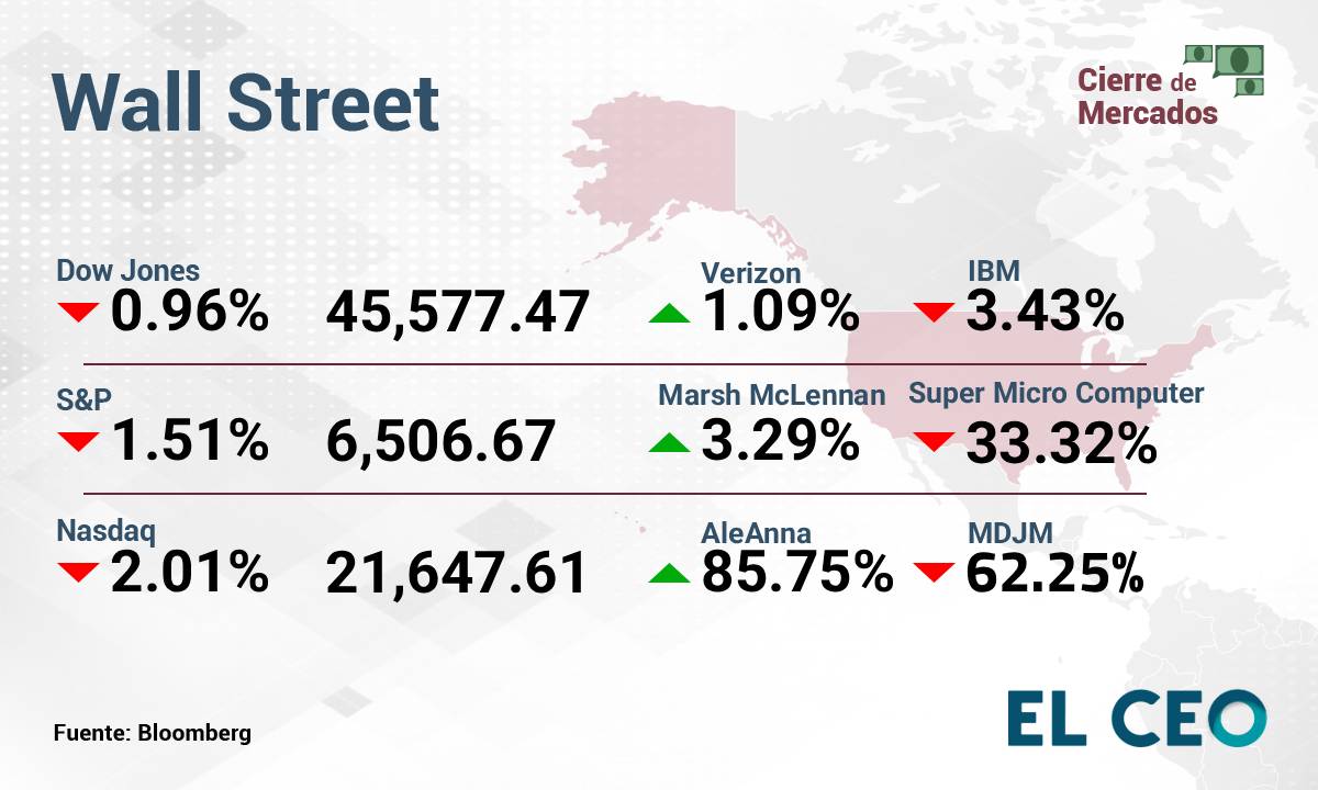 El S&P 500 perdió 1.51%, a 6,506.67 puntos, mientras que el Nasdaq Composite retrocedió 2.01%, a 21,647.61 unidades. Por su parte, el Promedio Industrial Dow Jones cedió 0.96%, a 45,577.47 puntos, de acuerdo con datos de Bloomberg.