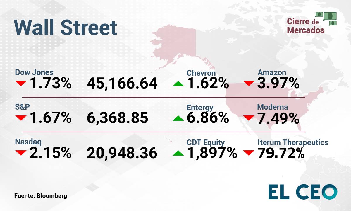 El S&P 500 perdió 1.67%, a 6,368.85 puntos, mientras que el Nasdaq Composite bajó 2.15%, a 20,948.36 unidades. Por su parte, el Promedio Industrial Dow Jones descendió 1.73%, a 45,166.64 puntos, de acuerdo con datos de Bloomberg.