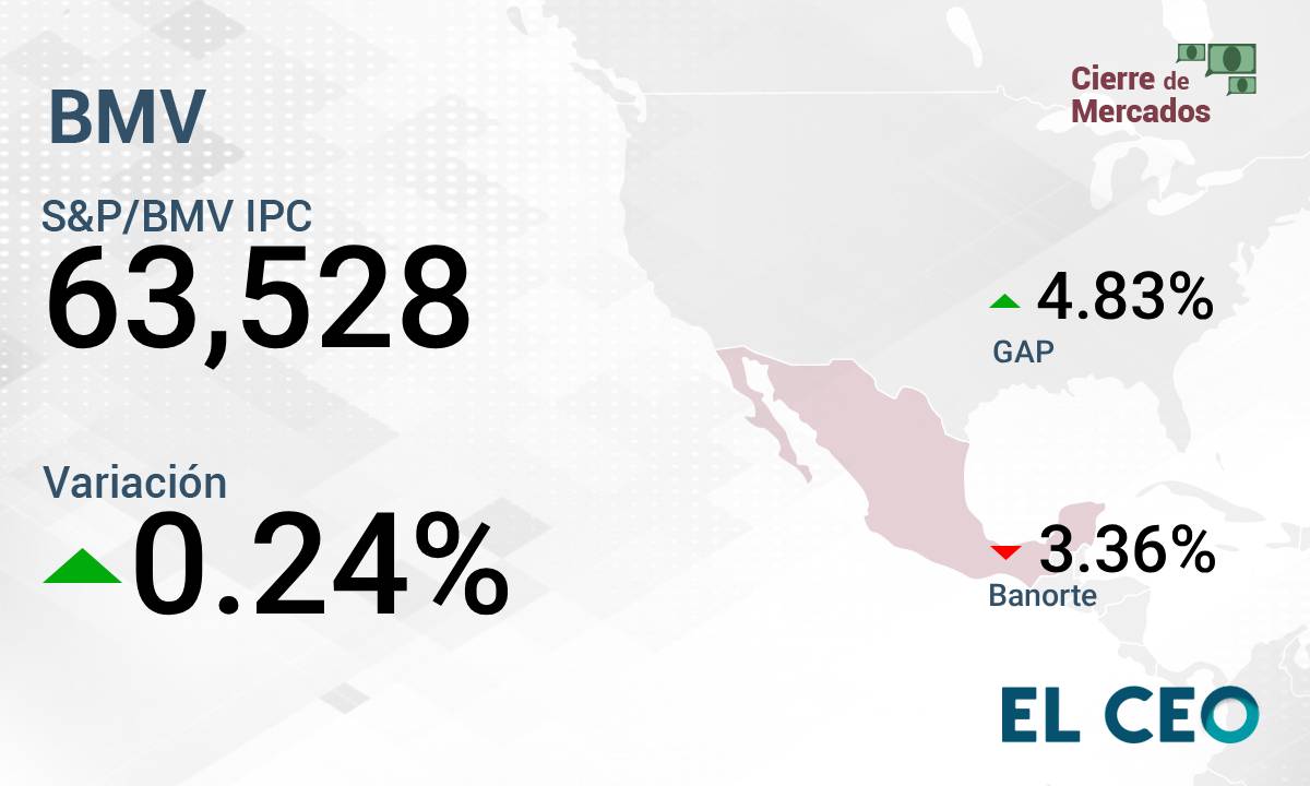 El Índice de Precios y Cotizaciones (IPC) de la Bolsa Mexicana de Valores (BMV) cerró las operaciones de este lunes con una ganancia de 0.24%, a 63,528 puntos, de acuerdo con la propia institución bursátil.