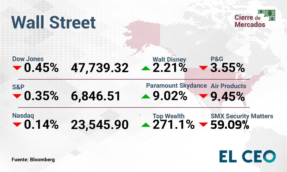 El S&P 500 perdió 0.35%, a 6,846.51 puntos, mientras que el Nasdaq Composite retrocedió 0.14% a 23,545.90 unidades. Por su parte, el Dow Jones cayó 0.45% a 47,739.32 puntos, de acuerdo con Bloomberg.