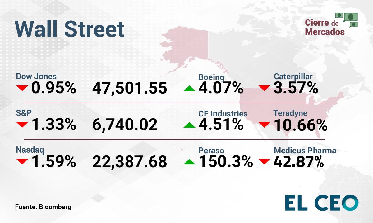 El S&P 500 pierde 1.36%, a 6,737.44 puntos, mientras que el Nasdaq Composite retrocede 1.44%, a 22,421.86 unidades. Por su parte, el Promedio Industrial Dow Jones cede 1.85%, a 47,060.78 puntos, de acuerdo con datos de Bloomberg.