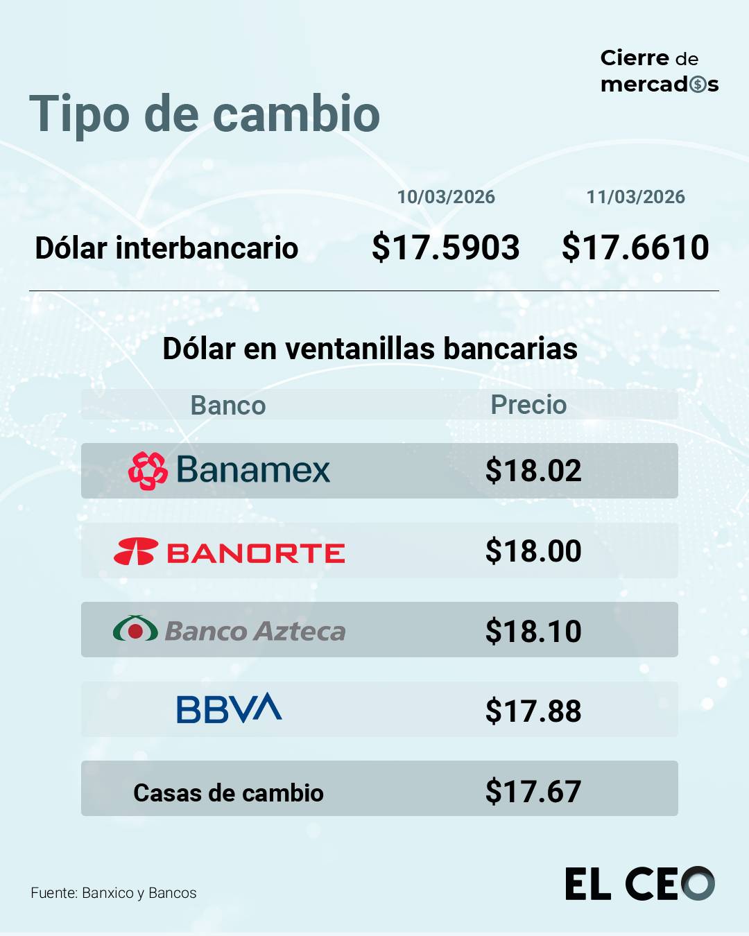 Durante las operaciones overnight, el peso marcó un mínimo de 17.52 y un máximo de 17.67 unidades por dólar.