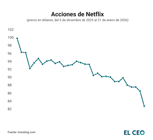 Desde el 5 de diciembre de 2025 —fecha oficial en que se dio a conocer el acuerdo con Warner Bros— hasta el 21 de enero de 2026, las acciones de Netflix acumulan una pérdida de 19.41%.