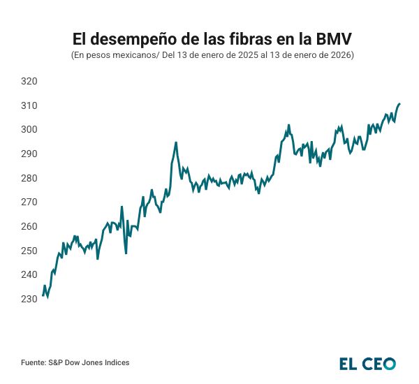 El S&P/BMV Fibras, que agrupa a los fideicomisos de inversión en bienes raíces, finalizó el 2025 con un avance de 29.9%. Este crecimiento estuvo por arriba del IPC, que tuvo en 2025 su mejor año desde 2009 con un avance de 28.9%.
