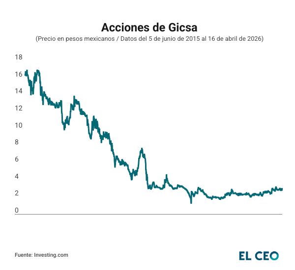 Gicsa ha tenido un paso tortuoso en el mercado accionario mexicano, pues desde que comenzó a cotizar el 5 de junio de 2015, hasta el cierre de este miércoles, los títulos bursátiles de la empresa han caído 81.83%.