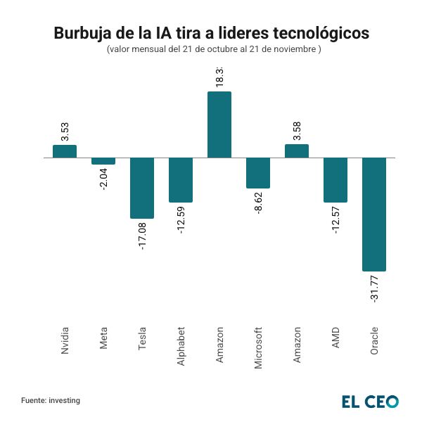 De estas empresas, sólo Alphabet, Amazon y Apple consiguieron esquivar el golpe de la burbuja, registrando un crecimiento mensual, correspondiente del 21 de octubre al 21 de noviembre de 2025, de 18.33%, 3.58% y 3.53% respectivamente.