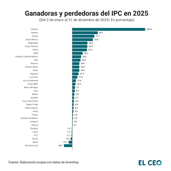 De la muestra de 35 emisoras que componen el índice, 29 lograron finalizar 2025 con un alza en el precio de sus títulos en el año, de acuerdo con datos de Investing al cierre de 31 de diciembre.