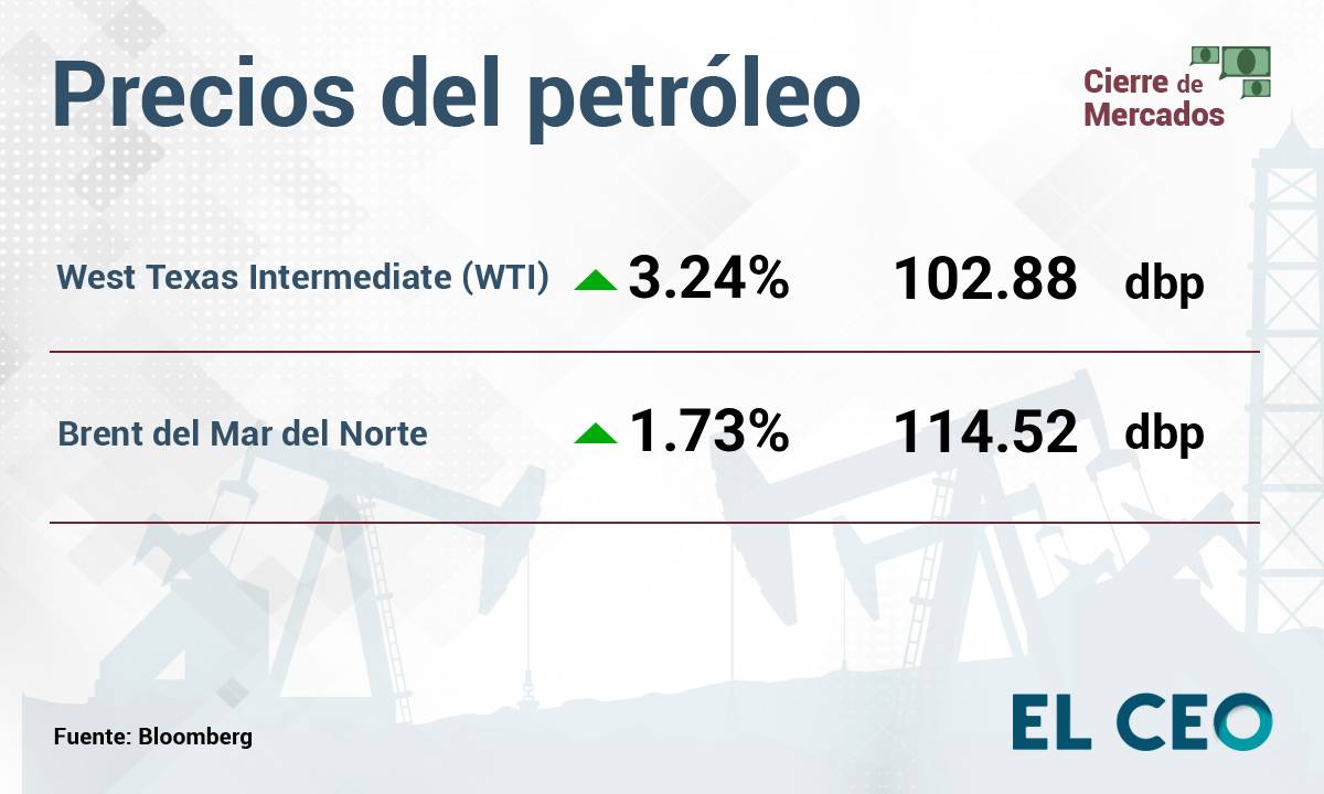 El contrato de abril del West Texas Intermediate (WTI), que había logrado mantenerse por debajo de los 100 dólares desde que inició el conflicto, subió 3.24%, a 102.88 dólares. Por su parte, el contrato del Brent del Mar del Norte a abril ganó 1.73% a 114.52 dólares, de acuerdo con Bloomberg.