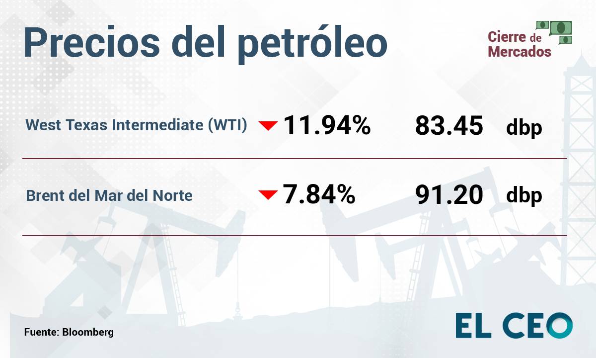 El contrato a marzo del West Texas Intermediate (WTI) bajó 11.94%, a 83.45 dólares. Por su parte, el contrato de abril del Brent del Mar del Norte a marzo retrocedió 7.84% a 91.20 dólares, de acuerdo con Bloomberg. Con esto, el crudo estadounidense registró su peor caída desde el 5 de julio de 2022, cuando descendió 12.57%