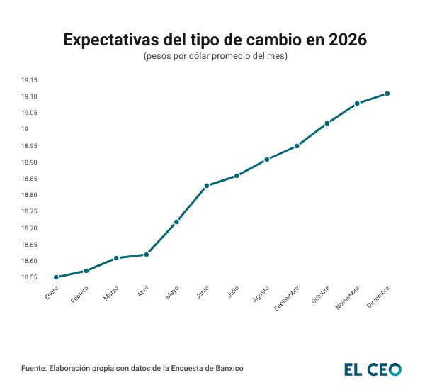 Con ello, el tipo de cambio para cierre de 2026 será de 19.12 pesos por dólar, según la encuesta.