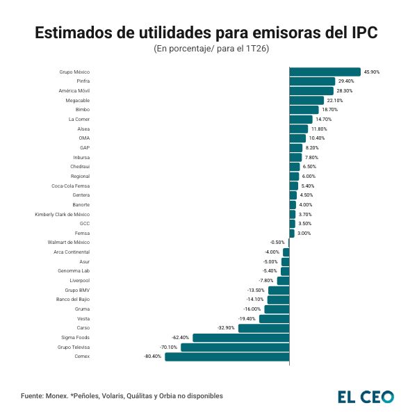 La temporada de reportes trimestrales está por comenzar y las emisoras que conforman el S&P/BMV IPC de la Bolsa Mexicana de Valores (BMV) se perfilan para un primer trimestre definido por el tipo de cambio y el conflicto bélico en Medio Oriente.