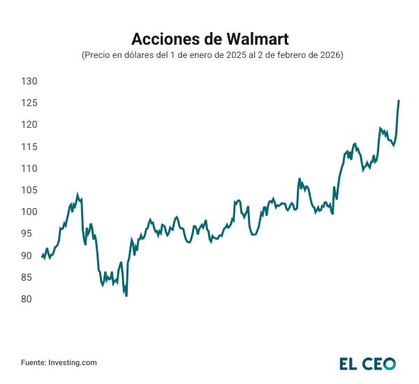 Durante las operaciones de este martes, las acciones de la minorista suben 2.27%, a 126.87 dólares (Ciudad de México, 10:11 horas). Con esto, los títulos de Walmart acumulan una ganancia de 40.44% desde inicios de 2025, impulsada por el crecimiento de sus ventas y su apuesta a la tecnología, y tan sólo en lo que va del 2026 han registrado un alza de 13.62%.