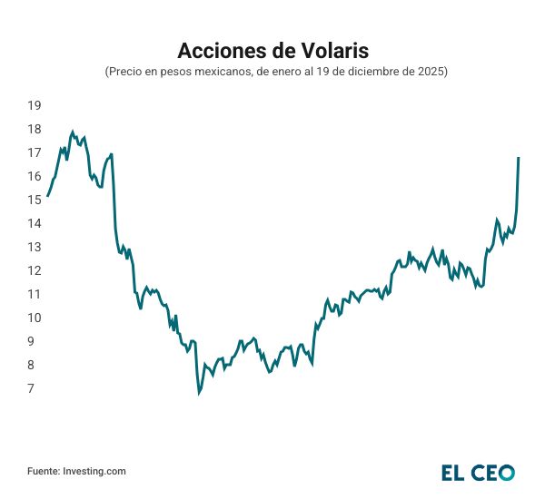 Al término de la jornada, las acciones de Volaris ganaron 14.84%, a 17.10 pesos, de acuerdo con datos de Investing. Con esto acumula una ganancia en lo que va del 2025 de 12.57%.