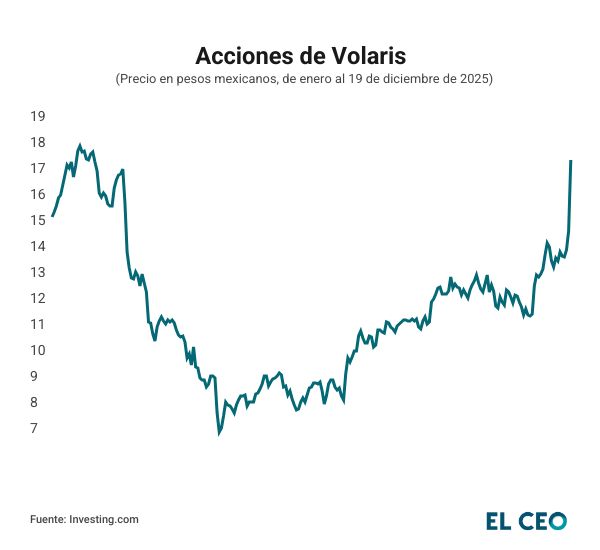 Al momento, las acciones de Volaris ganan 20.01%, a 17.87 pesos (Ciudad de México, 8:57 horas), de acuerdo con datos de Investing. Con esto acumula una ganancia en los que va del 2025 de 12.57%.