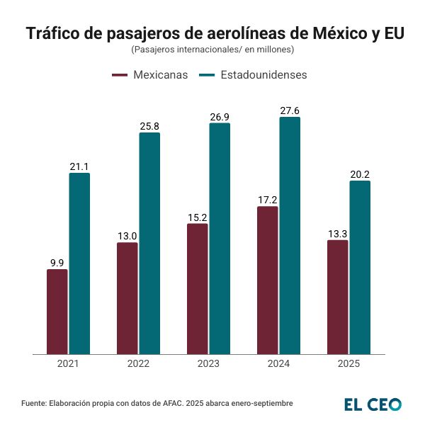La historia es similar en lo que va de este año, en el que las aerolíneas estadounidenses transportaron 51% más viajeros que las mexicanas de enero a septiembre.