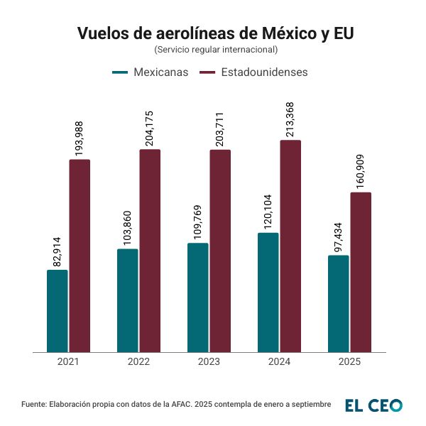 Otro indicador son los vuelos de servicio regular internacional, que incluye pasajeros, carga y combinados. El año pasado las aerolíneas de Estados Unidos realizaron 78% más vuelos que las nacionales. Para los primeros nueve meses de 2025, arroja que el dominio de las estadounidenses es de 65%.