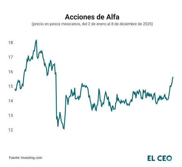 En la sesión del lunes, las acciones de la compañía cerraron en 15.82 pesos cada una, un alza de 2.06% respecto al cierre del viernes. De esta forma, el rendimiento de Alfa es de 4.83% en el acumulado del año.