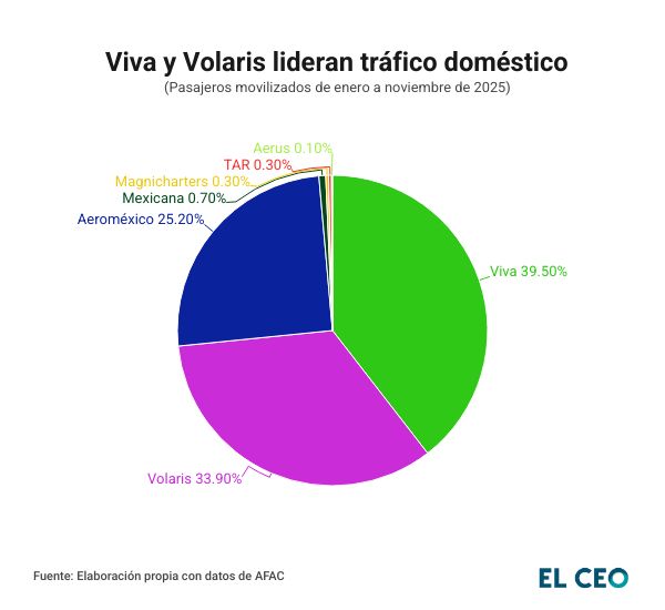Entre enero y noviembre de 2025, Viva Aerobus y Volaris concentraron 39.5% y 33.9% del tráfico nacional de pasajeros, respectivamente, de acuerdo con datos de la Agencia Federal de Aviación Civil (AFAC). En conjunto, acumularon una participación de mercado de 73.4%, lo que las posiciona como el primer y segundo jugador del país.