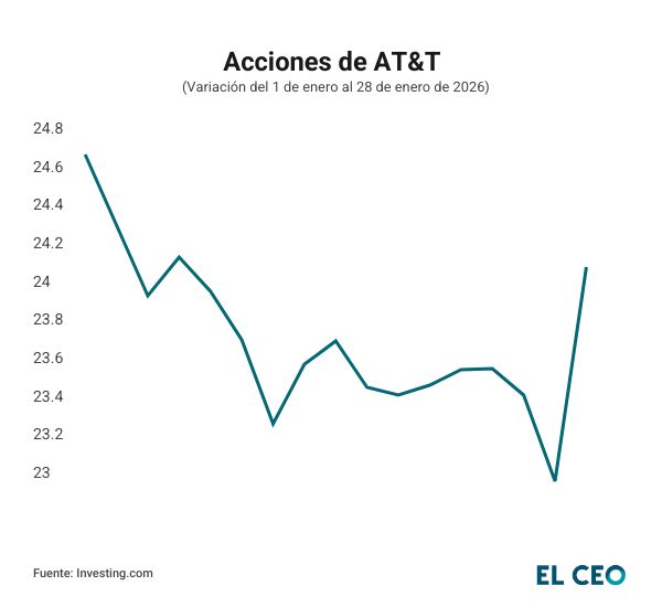 Luego de la publicación del reporte trimestral de AT&T, las acciones de la compañía que cotizan en Wall Street registran un alza de 4.91%, a 24.12 dólares (Ciudad de México, 12:46 horas), según datos de Investing. Pese a esto la empresa no logró recuperar las pérdidas que ha tenido desde que comenzó el 2026, por lo que acumula una caída de 2.90% en lo que va del año.